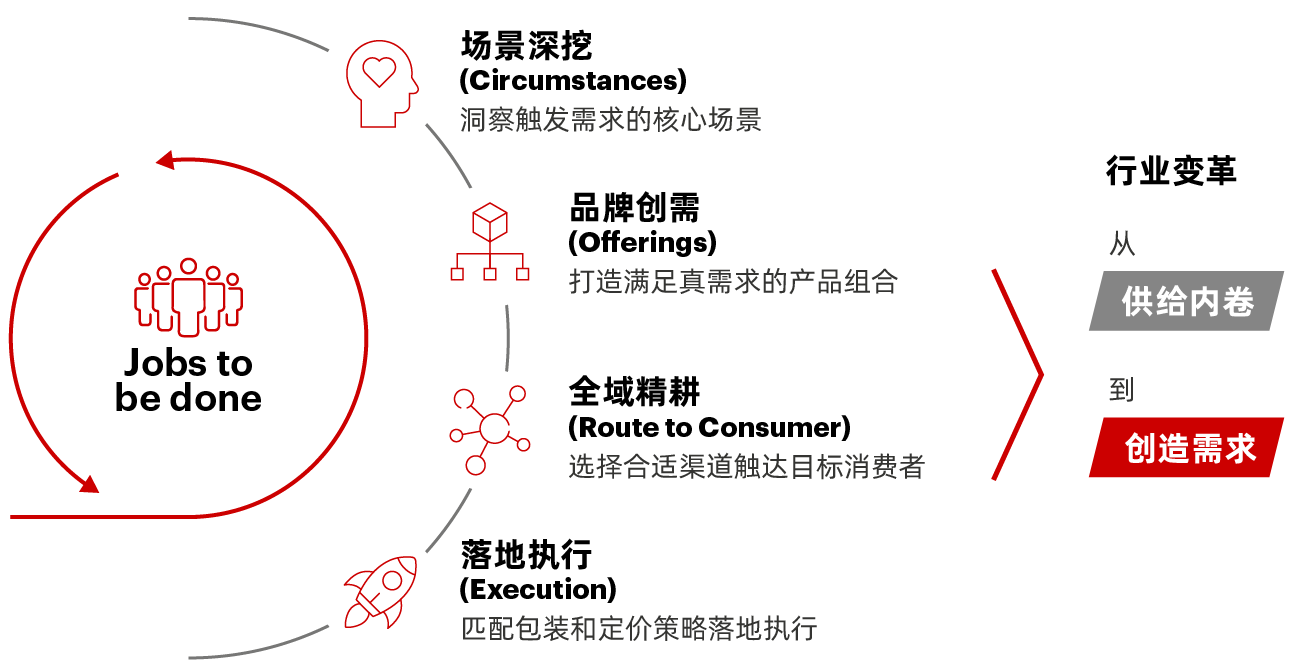 品牌创需的核心是围绕消费者“Jobs-to-be-Done”,以“品类升级+品牌升维”为双引擎,打造覆盖功能、情绪、社交三维诉求的解决方案——人们购买的不是产品本身,而是特定场景下完成某项任务的完整方案。