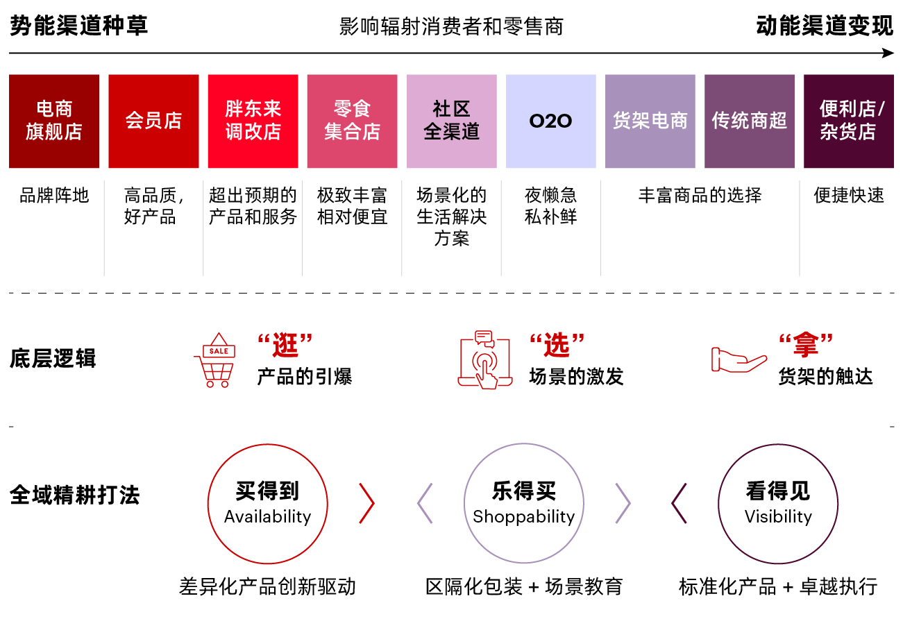 基于对渠道的剖析,我们可以进一步用“逛”,“选”,“拿”来概括势能渠道、即时零售渠道和动能渠道的精髓。消费者在势能渠道“逛”,需要用产品引爆;消费者在即时零售“选”,需要用场景激发;消费者在动能渠道“拿”,需要用货架触达。